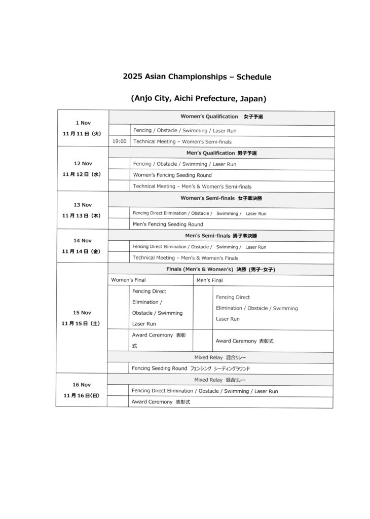 2025 Asian Championships – Schedule (Anjo City, Aichi Prefecture, Japan)/2025年 アジア選手権 日程表